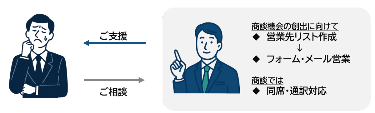 必要に応じて通訳や資料翻訳を行い、内容の正確な伝達と商談後のフォローアップ、条件交渉支援まで一貫してサポートします。
